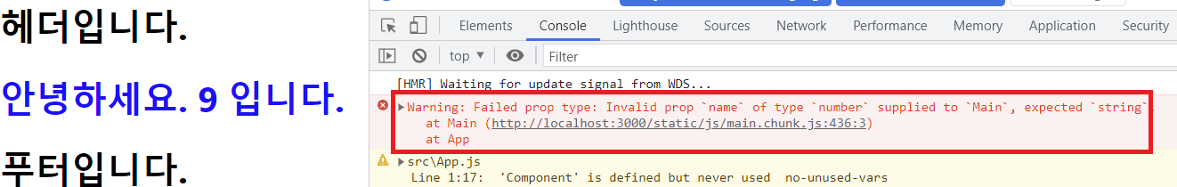 (Warning: Failed prop type: Invalid prop `name` of type `number` supplied to `Main`, expected `string`. at 컴포넌트명)