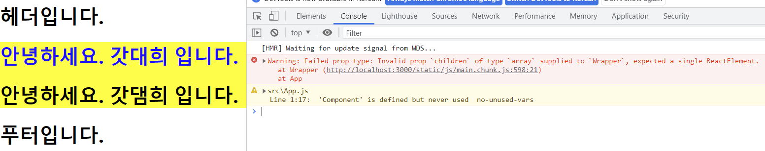 Warning: Failed prop type: Invalid prop `children` of type `array` supplied to `Wrapper`, expected a single ReactElement. at 컴포넌트명