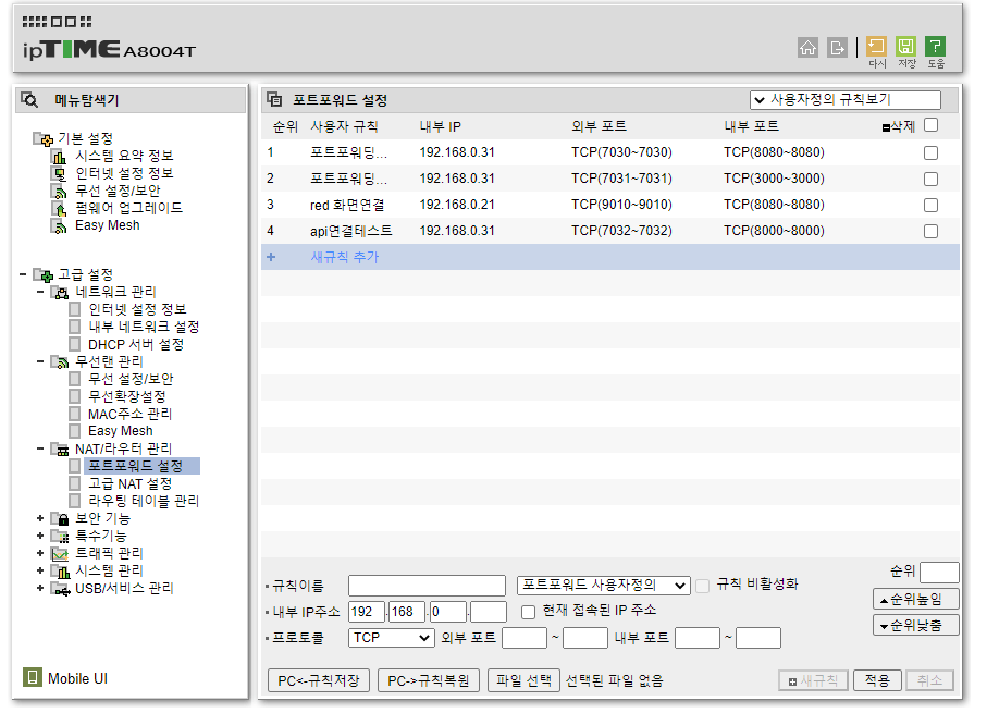 포트포워드 설정 화면