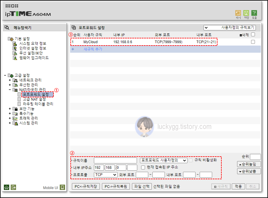 왼쪽의 관리도구 버튼을 클릭하고, 좌측의 고급 설정 > NAT/라우터 관리 > 포트포워드 설정 메뉴를 선택합니다. 아래 그림은 MyCloud(IP: 192.168.0.6, Port: 21)가 외부 포트 7999로 포트 포워딩되어 있는 모습입니다.