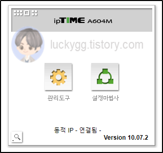 2. 로그인 후 (아이디 및 비밀번호 기본 값은 admin / admin입니다. 만약, 로그인이 안 된다면 이미 설정이 변경된 상태입니다. 이 경우, ipTIME 제품 뒷면의 리셋 버튼을 5초 이상 눌러주어 초기화해야 합니다.) 톱니바퀴모양 관리도구 클릭