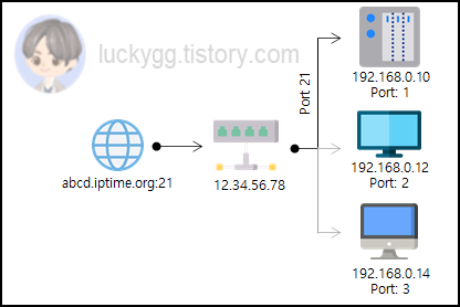 - 외부에서 xxx.iptime.org:N(N: 외부 포트 번호)와 같은 주소로 접속하면, 내부의 특정 장치로 접속이 가능하다.