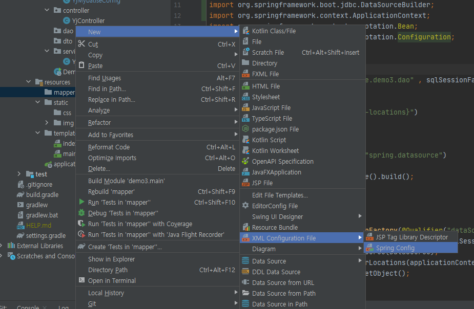 그 다음 resoures 안에 mapper 디렉토리 생성 후 mapper 안에 xml 파일 생성해준다.