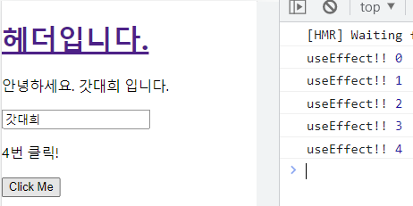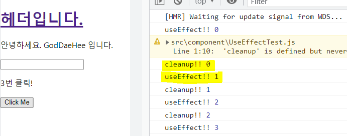 - 클릭시 cleanup 함수에서는 이전 count값, 그리고 렌더링 이후 변경된 count값이 찍히는 것을 볼 수 있다.