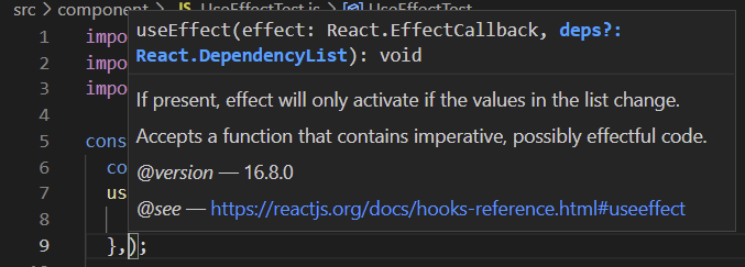 - 첫번째 인자(effect)는 함수, 두번째 인자는 배열(deps)이 들어간다.