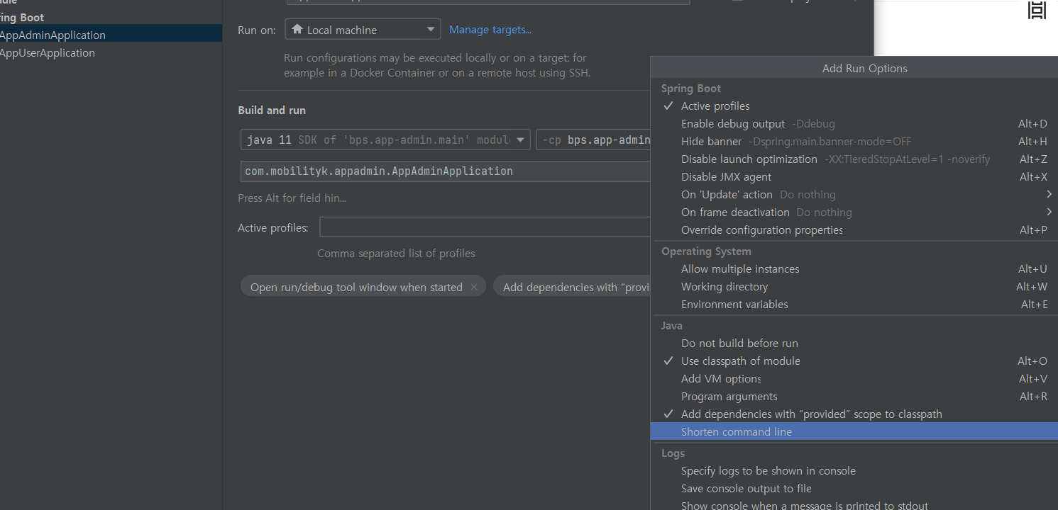 Command line is too long 하길레 Error running 'AppAdminApplication': Command line is too long. Shorten command line for AppAdminApplication or also for Spring Boot default configuration. 랑 헷갈려서 dynamic.classpath 추가해줬으나 해결되지 않았다