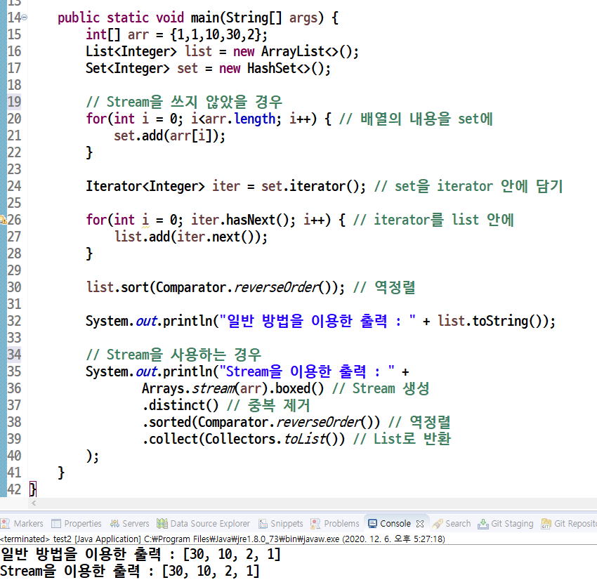 스트림은 배열이나 컬렉션(List, Set, Map)으로 원하는 값을 얻을 때