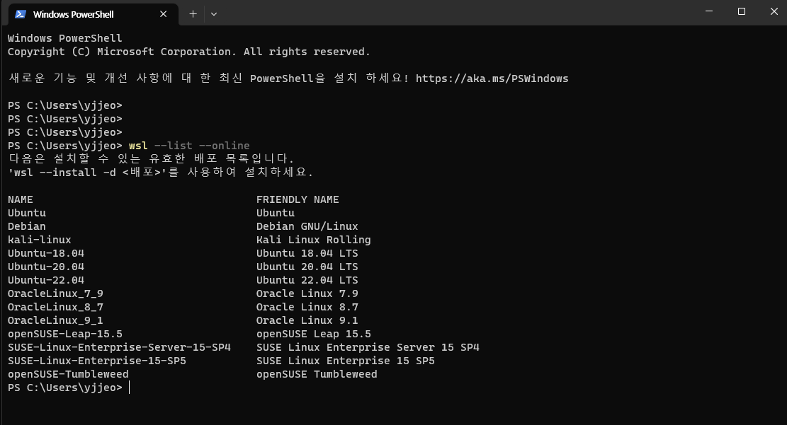 이후 해당 명령어를 입력하면 현재 배포중인 리눅스 배포판을 확인할 수 있다.