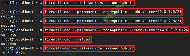 # firewall-cmd --permanent --zone=public --remove-source=10.0.2.0/24