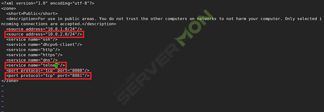 자 그럼 위에서 추가했다가 삭제했던 telnet서비스, 8081포트, 10.0.2.0/24 대역을 xml 파일에