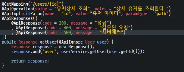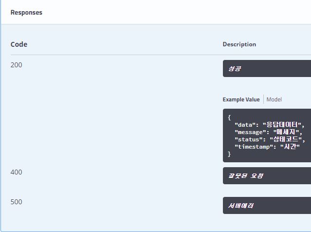 @ApiResponse 어노테이션을 선언해주면 API 상태코드값별로 메세지를 커스텀할 수 있다.