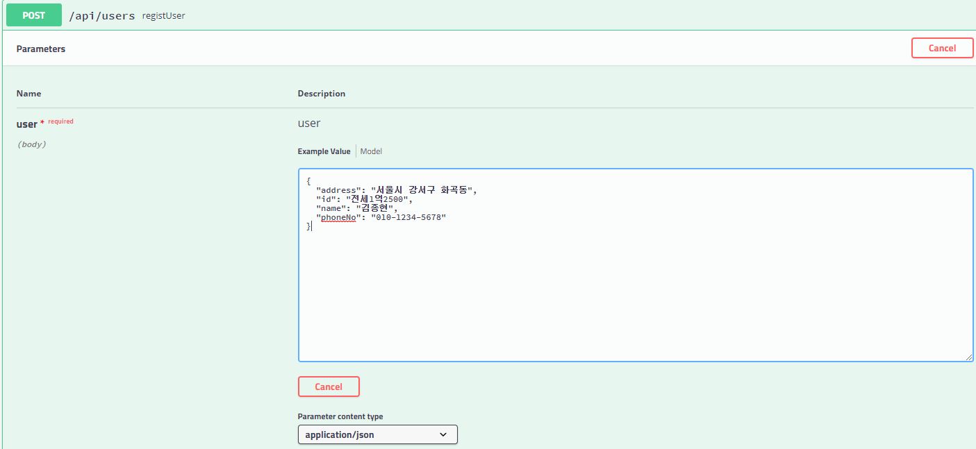 @RequestBody 어노테이션이 선언된 API를 테스트 할때는 json 포맷으로 데이터를 입력할 수 있게끔 제공해주고