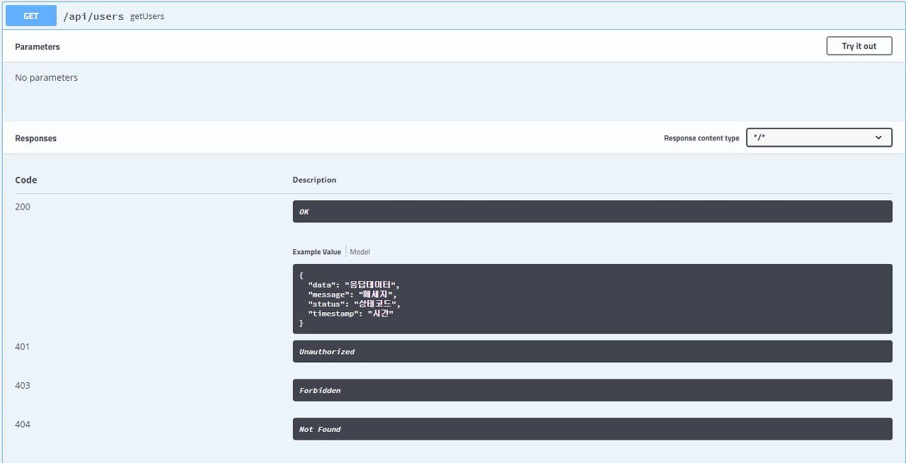 Response를 보면 Swagger에서는 200, 401, 403, 404 같은 기본상태코드에 대한 디폴트메세지를 제공해준다.