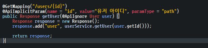 이처럼 @ApiIgnore 어노테이션을 선언해주면 해당정보는 화면에 나오지 않게된다.