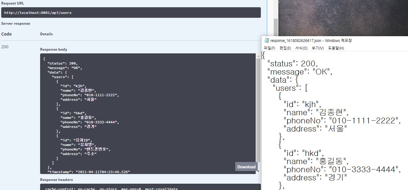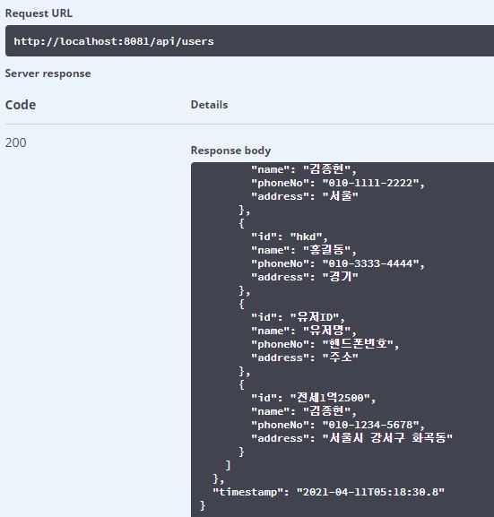 테스트를 하고나면 해당 API를 호출했을때 응답데이터가 정상적으로 내려온걸 확인할 수 있고