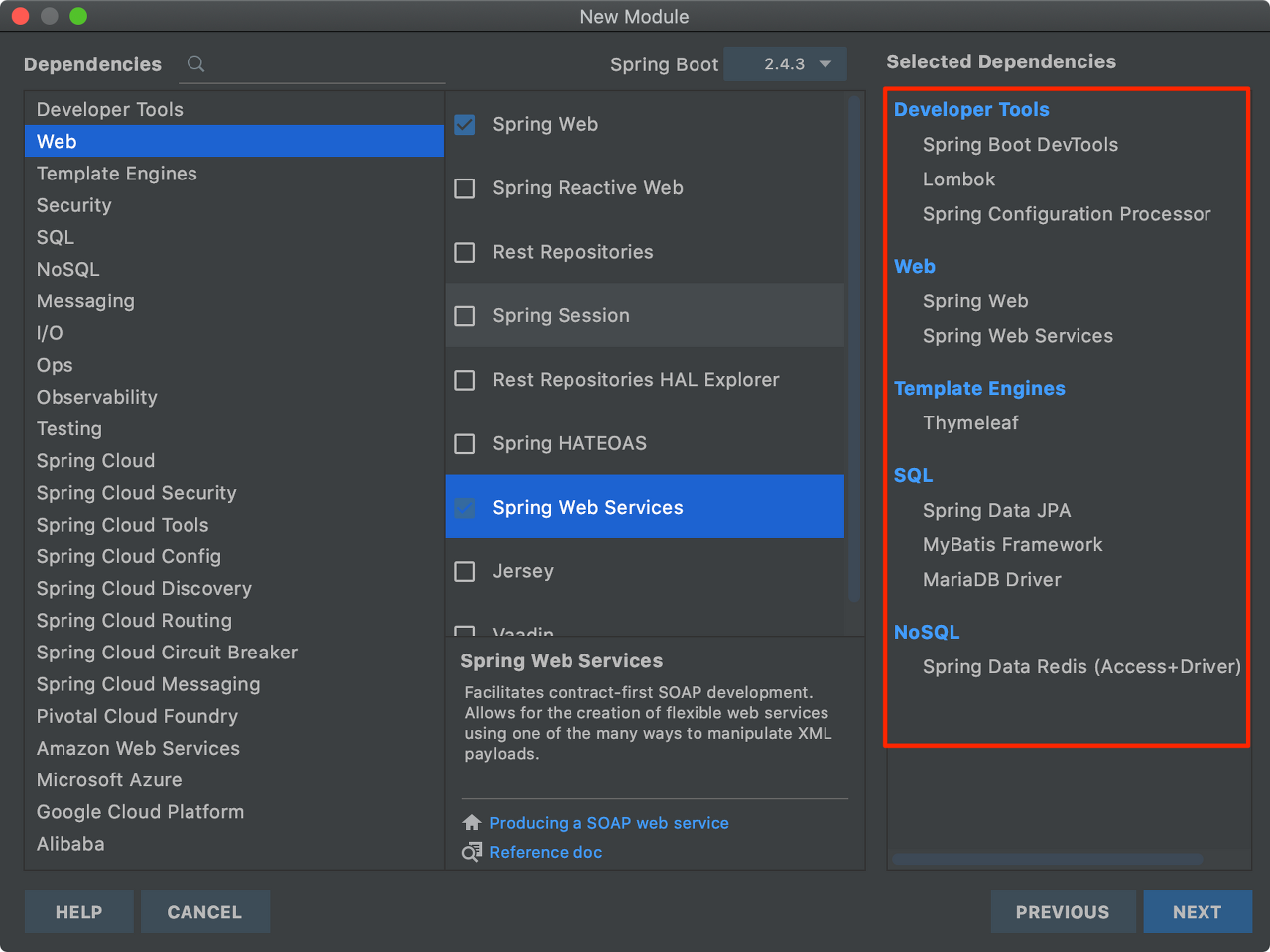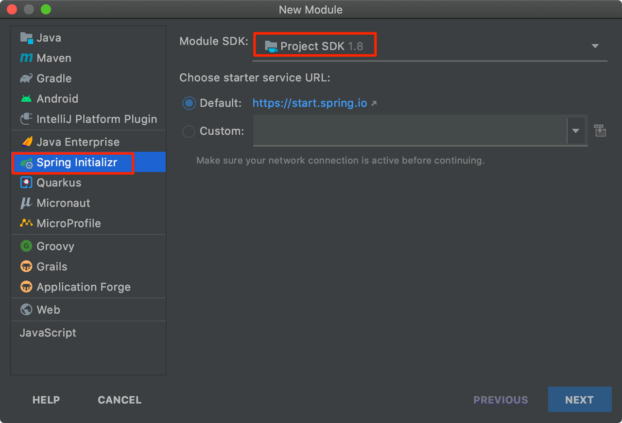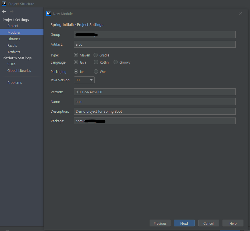 2. modules + 에서 new module Spring Initializr 에서 기본 설정