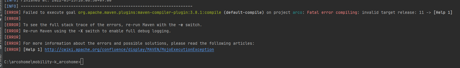 [ERROR] Failed to execute goal org.apache.maven.plugins:maven-compiler-plugin:3.8.1:compile (default-compile) on project arco: Fatal error compiling: invalid target release: 11 -> [Help 1]