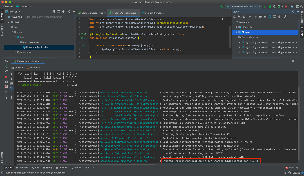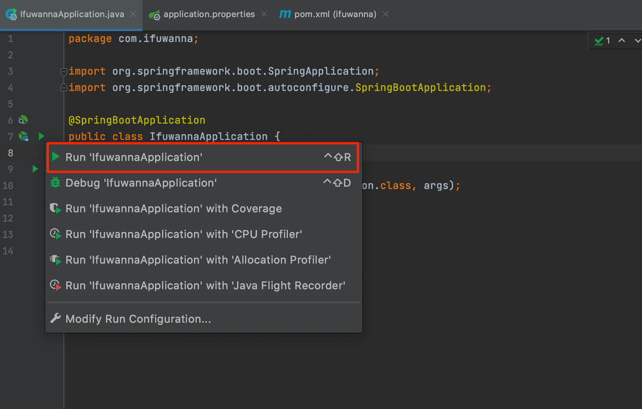 11. 내장톰캣을 사용하는 Jar로 패키징을 선택했기 때문에 별도 설정 없이 바로 스프링부트 어플리케이션을 실행해 보도록 하겠습니다. Build Project(⌘+F9) 후 메인 클래스 옆의 실행버튼이나 상단 실행버튼(^+R)을 눌러 실행해 주세요.