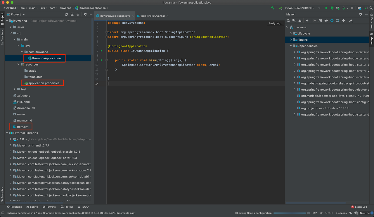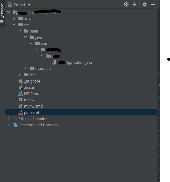 그리고 아까 빌드도구로 선택했던 Maven을 위한 설정파일인 pom.xml과 선택했던 라이브러리의 의존성 설정들이 자동으로 추가되어 프로젝트로 내려받아 진 것을 확인 하실 수 있습니다.