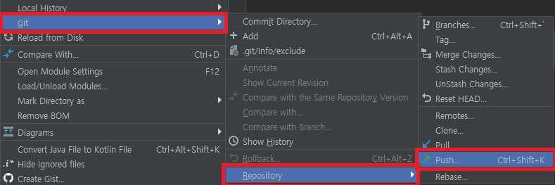- Project폴더에서 마우스 우클릭 >> Git >> Repository >> Push