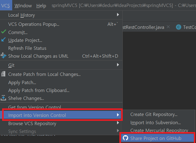 - VCS >> Import into Version Control >> Share Project on Github 클릭