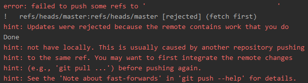 - 혹시 프로젝트를 생성할 때 자동으로 READEME.md 파일을 생성했다면 다음과 같은 오류가 발생할 수 있으니 참고 하자.