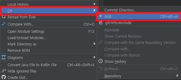 - Project 폴더에서 마우스 우클릭 >> Git >> Add 메뉴 클릭