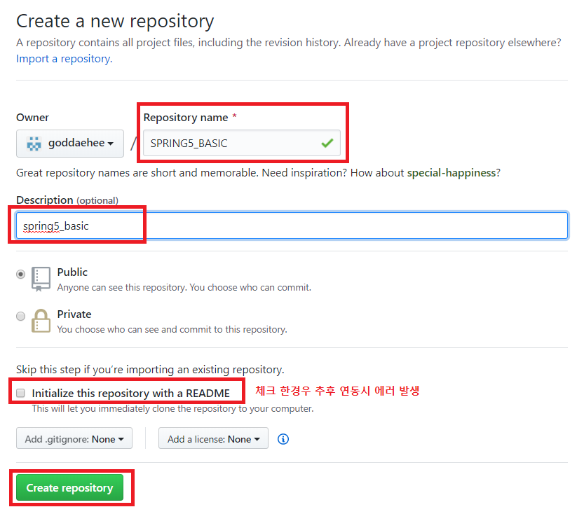 1) 첫번째 방법 : 프로젝트 명으로 자동으로 Repository를 생성하여 Github 연동