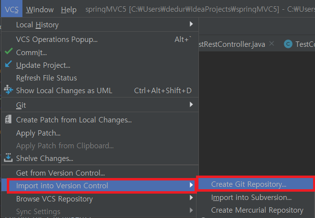 - VCS >> Import into Version Control >> Create Git Repository... 클릭