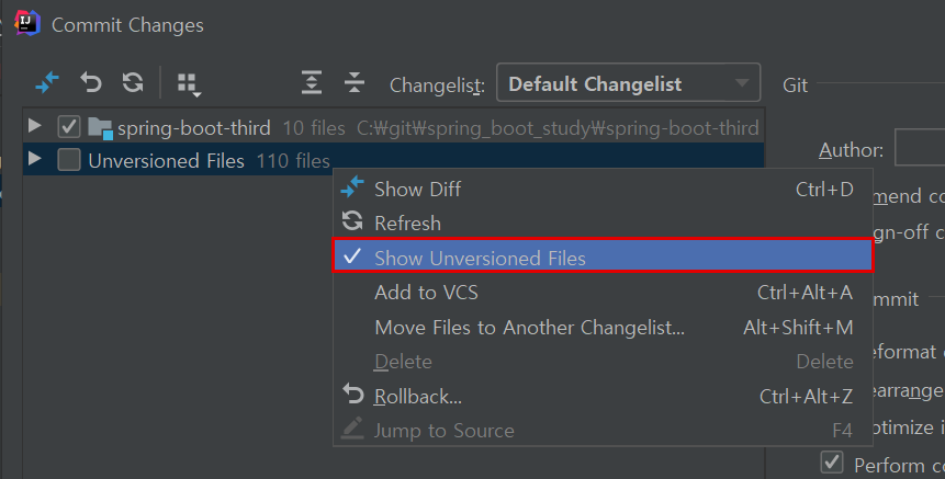 커밋 창에서 unversioned 파일을 굳이 보이지 않게 함으로써 인텔리J에서 커밋 속도를 향상시킬 수 있다.