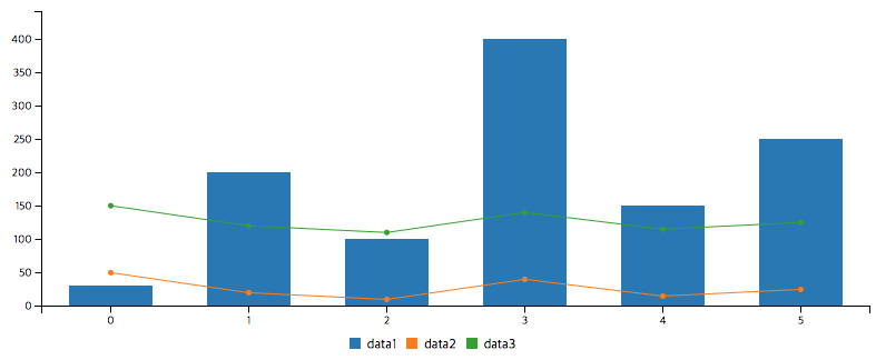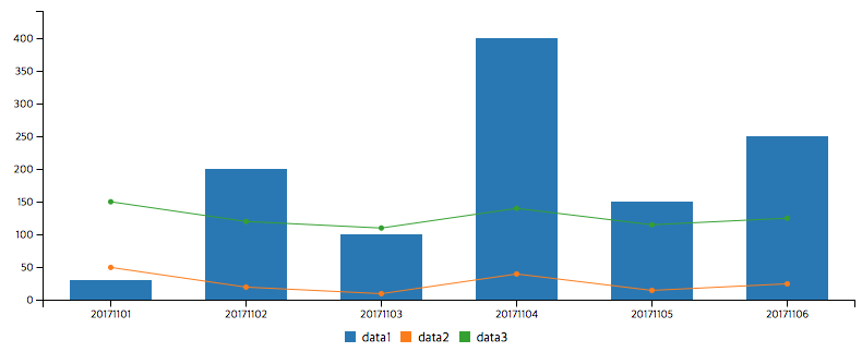 type을 line으로 설정했습니다. 이것은 기본적으로 line의 형태로 그래프를 그리라는 것 입니다. 하지만 types에서 data1은 bar그래프로 그리라고 설정했기 때문에 data1에 대한 그래프만 bar 그래프로 표현합니다.