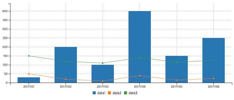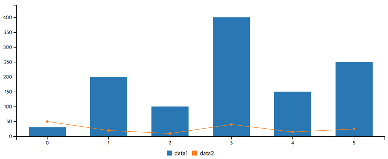 type을 line으로 설정했습니다. 이것은 기본적으로 line의 형태로 그래프를 그리라는 것 입니다. 하지만 types에서 data1은 bar그래프로 그리라고 설정했기 때문에 data1에 대한 그래프만 bar 그래프로 표현합니다.