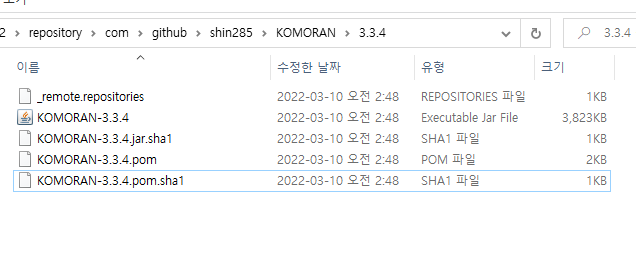 repository -> com -> github -> shin285 -> KOMORAN -> 3.3.4 폴더에 가면, 그림 1과 같이 jar 파일이 있는 것을 확인할 수 있다.