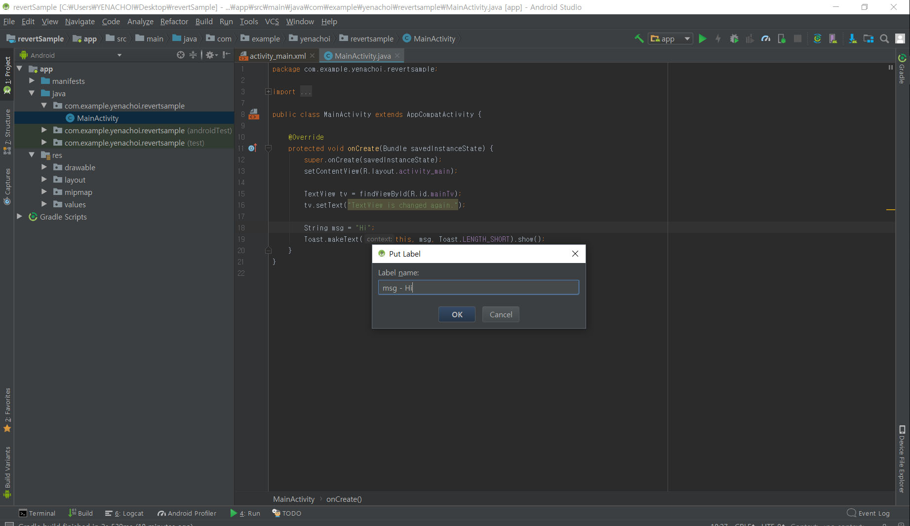 안드로이드 스튜디오에서 자동 저장을 해주는 건 매우 감사하지만, 수시로 업데이트가 되므로 코드를 찾기 헷갈릴 수 있다. 이 때 필요한 것이 lable 이다. 레이블을 지정해두면 Show History 창을 통해 롤백할 때 편리하게 롤백 지점을 찾을 수 있다.