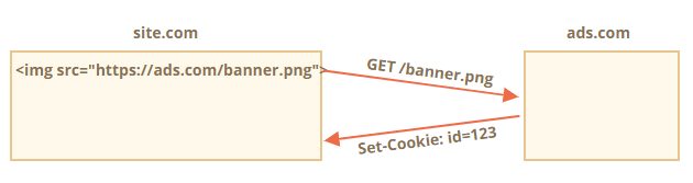 2. ads.com에 있는 원격 서버는 배너와 함께 Set-Cookie 헤더를 전송해 브라우저가 id=1234와 같은 쿠키를 설정하도록 합니다. 이 쿠키는 ads.com 도메인에서 설정한 것이기 때문에 ads.com에서만 볼 수 있습니다.