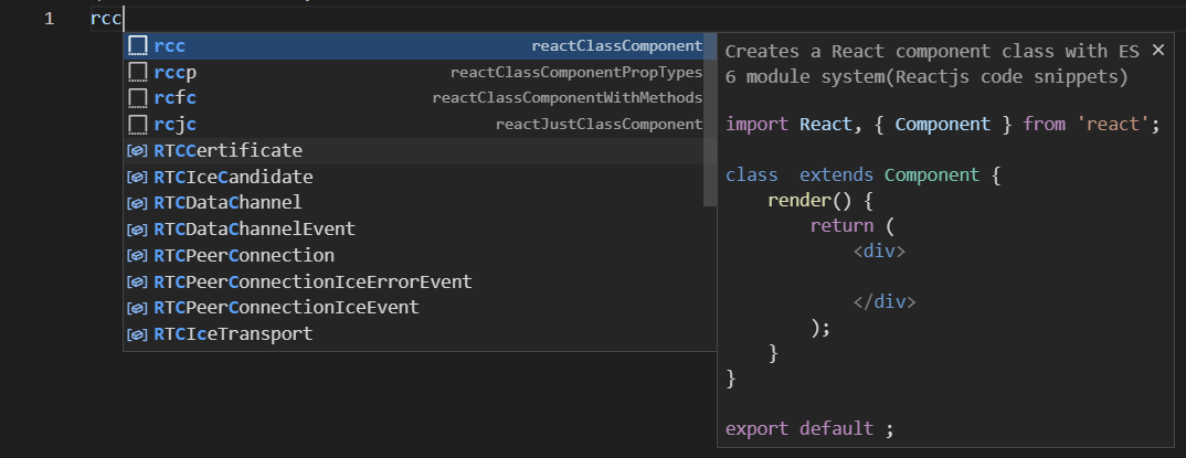 - 하기와 같이 입력 하거나, Reactjs Code Snippets를 설치했다면 rcc (React Class Component의 약자 )를 치면 편하게 생성할 수 있다.