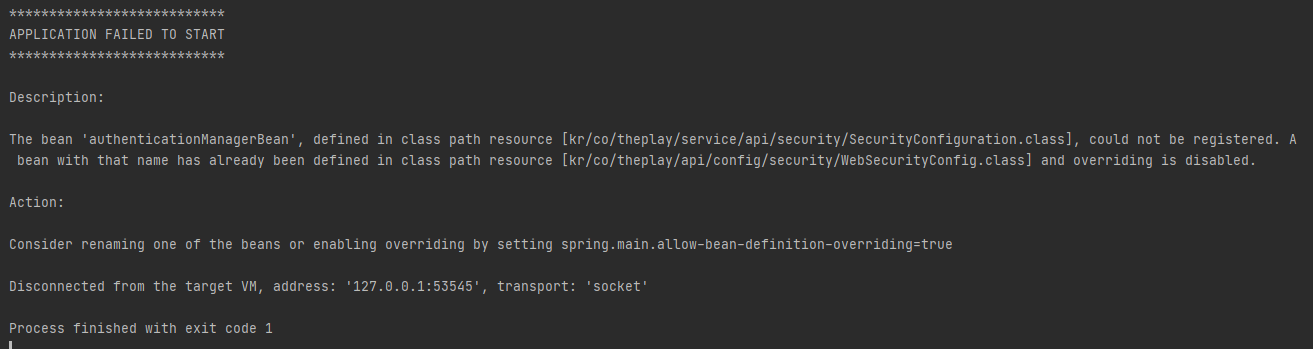 authenticationManagerBean이 중복선언되었다는 내용이다.