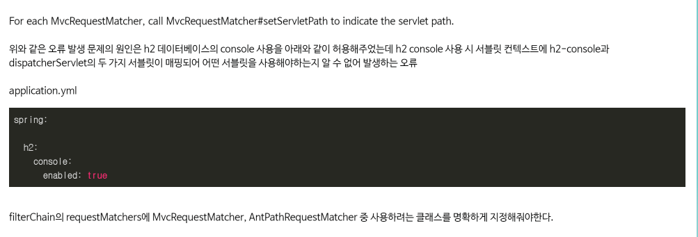 이런식으로 filterChain 에 requestMatchers 에 MvcRequestMatcher 로 명시를 해줘야 한다고 한다 경우에 따라 MVC 패턴이 아닌 경우에는 AntPathRequestMatcher 로 명시
