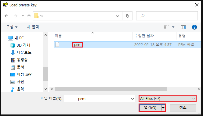 11-2. 파일형식 ALL Files 로 변경 후 아까 인스터스 생성 때 받아놓은 키 선택