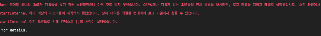 03-May-2024 17:39:01.857 심각 [localhost-startStop-1] org.apache.catalina.core.StandardContext.startInternal 하나 이상의 리스너들이 시작하지 못했습니다. 상세 내역은 적절한 컨테이너 로그 파일에서 찾을 수 있습니다.
