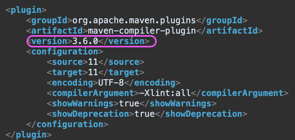 하지만, 프로젝트의 pom.xml에 명시된 maven complier 버전은 2.5.1 로 되어 있었습니다.