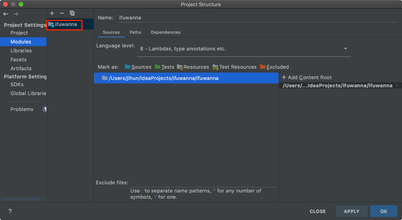 8. 스프링부트 프로젝트(모듈)이 추가된 것을 확인하실 수 있습니다. 모듈 Language level을 선택했던 jdk버전과 맞춰주고 OK를 눌러 생성된 프로젝트 구조를 살펴보겠습니다.