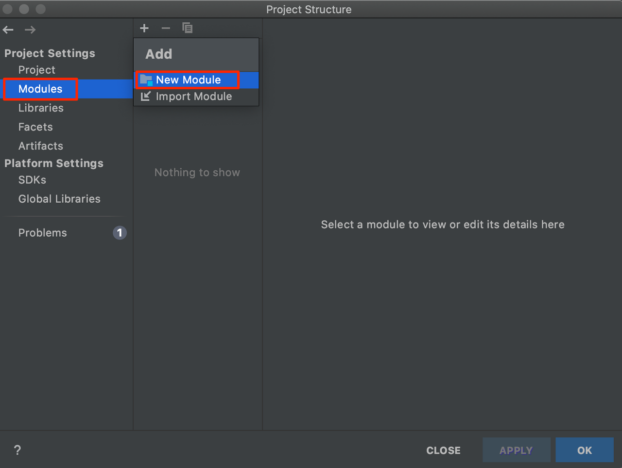 3. 빈 프로젝트 생성이 완료되면 바로 Project Structrue 메뉴가 뜨게 됩니다. 여기서 좌측 Modules > Add(+) > New Module 을 선택하여 스프링부트 모듈을 생성해 보도록 하겠습니다.