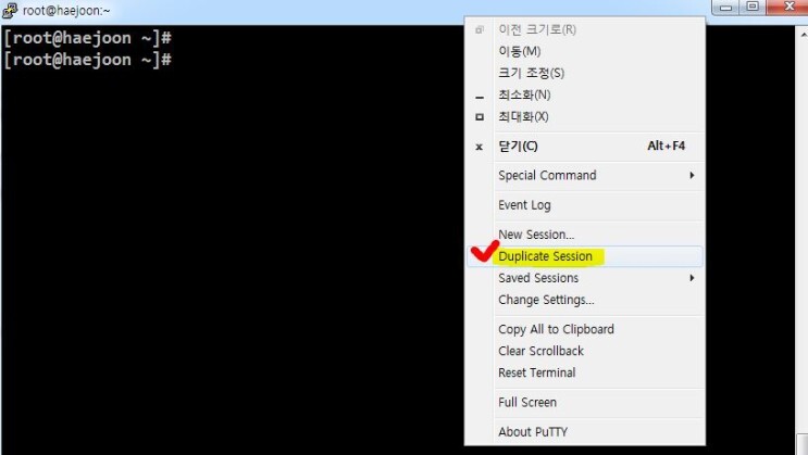 비밀번호 설정이 완료되었으면, PuTTY창 상단 바를 우클릭해서 'Duplicate Session' 버튼을 클릭해준다.