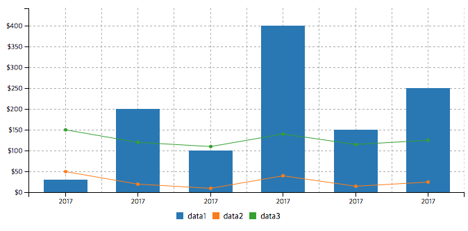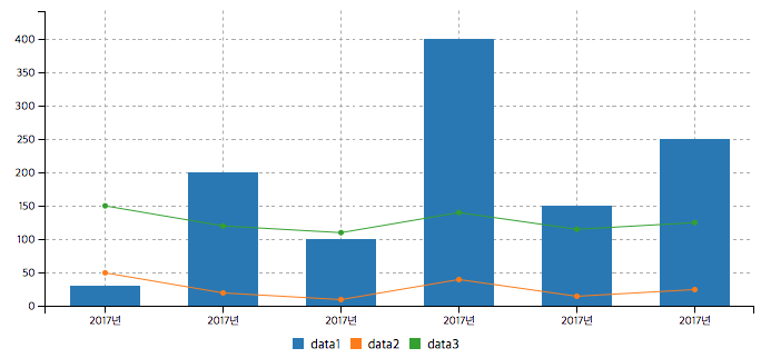 type을 line으로 설정했습니다. 이것은 기본적으로 line의 형태로 그래프를 그리라는 것 입니다. 하지만 types에서 data1은 bar그래프로 그리라고 설정했기 때문에 data1에 대한 그래프만 bar 그래프로 표현합니다.