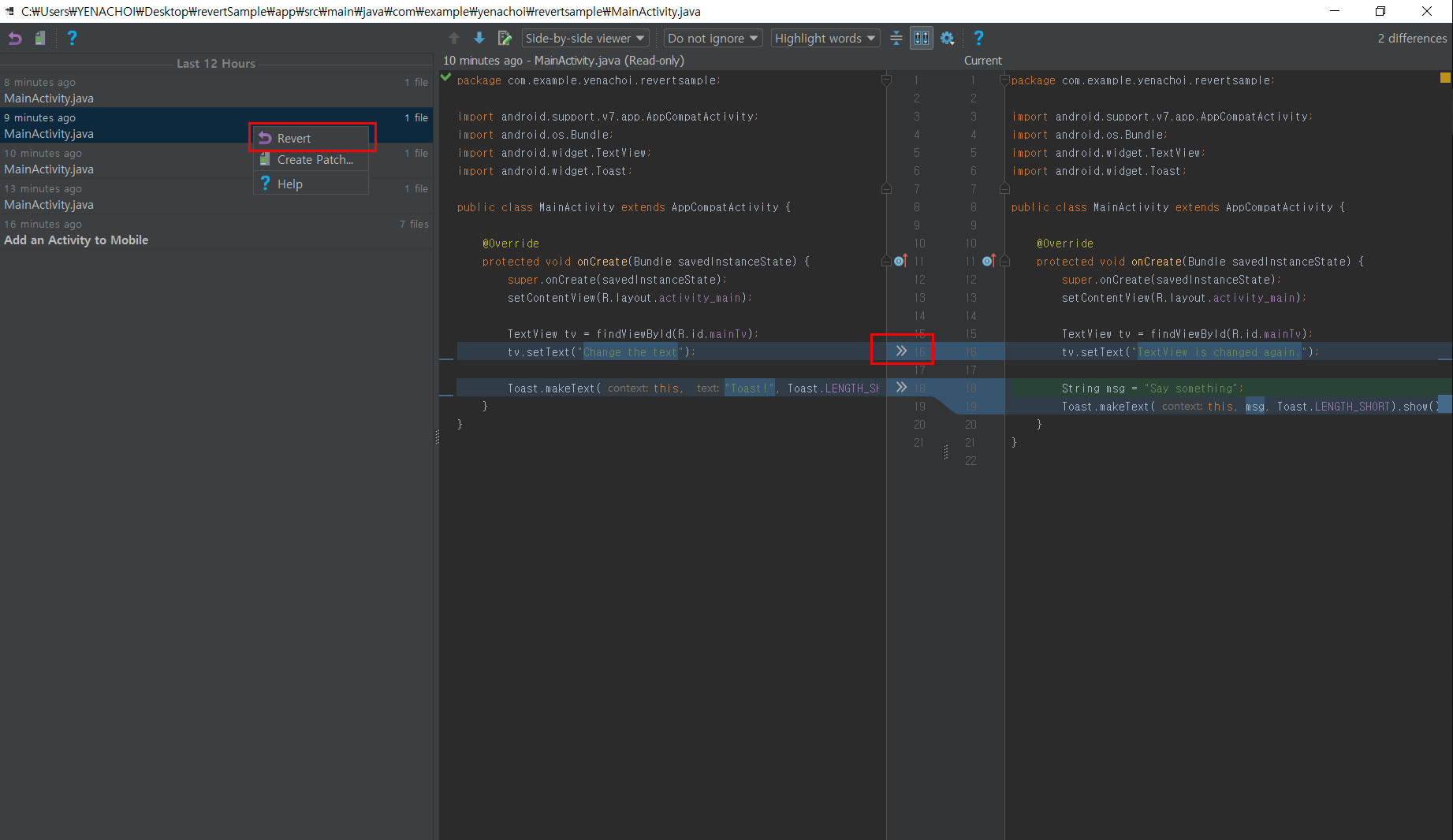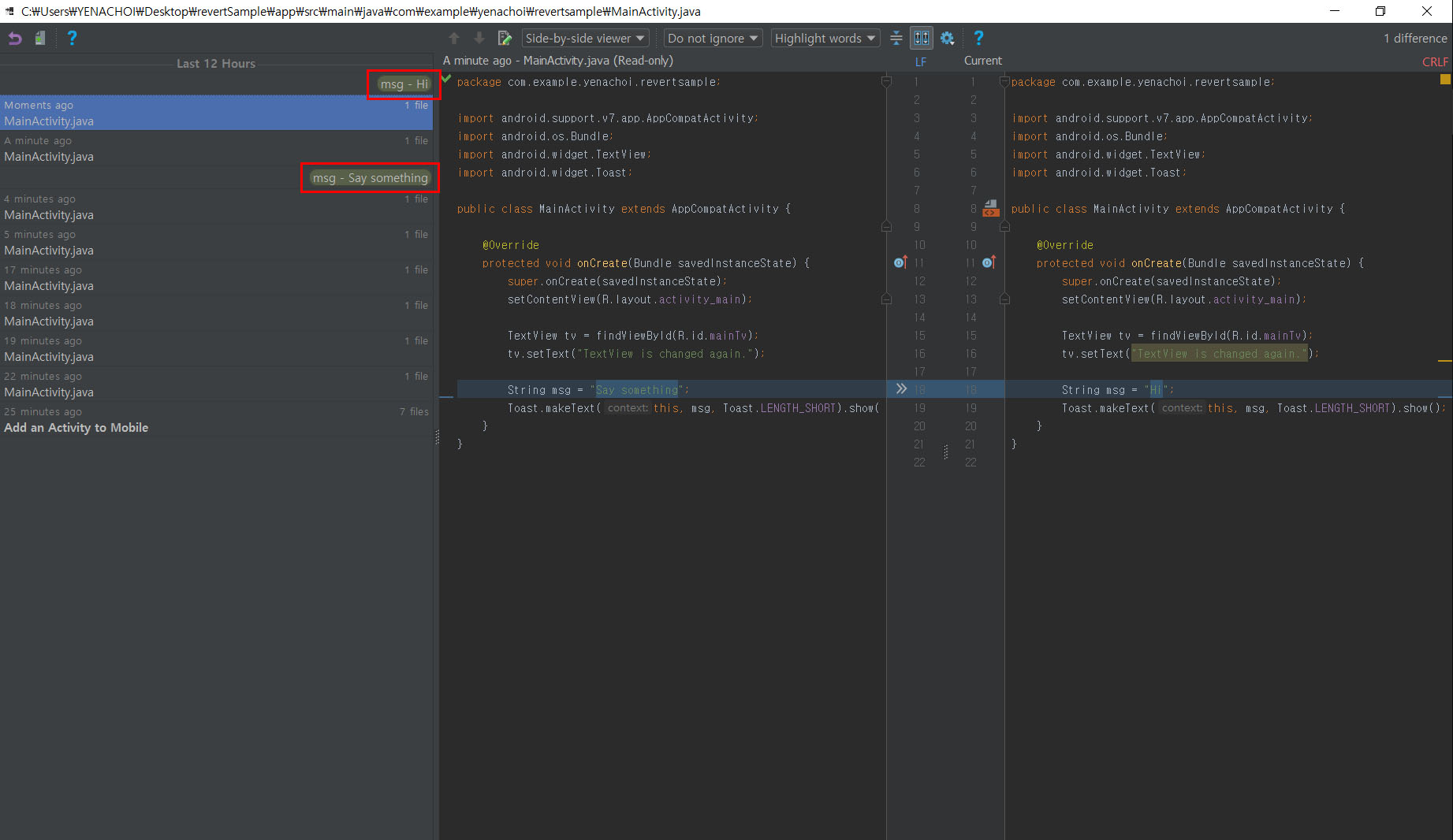버그 다 고치고 한꺼번에 commit해야지, 했다가 중간에 뭔가 꼬여서 대참사가 일어났다. 가장 최근에 한 commit이 어제 한 거라 거의 울 뻔하다가, Android Studio의 Local History 기능에 대해 알게 되었다.