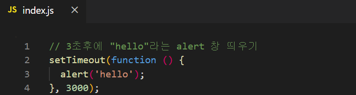 3초 후에 "hello"라는 alert 창을 띄우는 자바스크립트 코드 예시